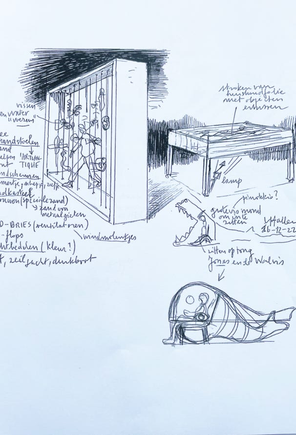 Ontwerpschetsen bij de enscenering ‘Het Interview dat sterft’ van Jan Fabre, van Luk van der Hallen en Paul Sochacki, Dommelhof, Neerpelt